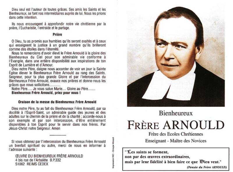 Seigneur, pour ta plus grande gloire et par l'intercession du Bienheureux Frère Arnould, exauce notre prière et donne-nous la grâce que nous sollicitons... et pour ton Église des vocations sacerdotales et religieuses, particulièrement des vocations de Frères des Écoles Chrétiennes.